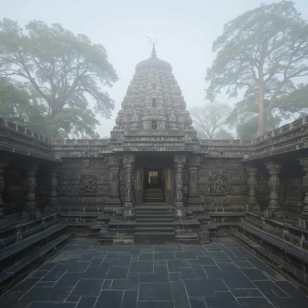There once was a glorious temple of Lord Shiva situated atop the highest peak of the Nilgiri Hills, shrouded in clouds for most of the year. The temple walls and grounds were made of black agate stone. The walls, both inside and outside, bore mesmerizing carvings. The temple compound stretched for several feet. Cedar trees hundreds of feet tall surrounded the compound. From dusk until dawn, the dim glow of the diyas burning in the temple was visible from villages in the valley. Thousands of stone steps connected the temple to the valley.